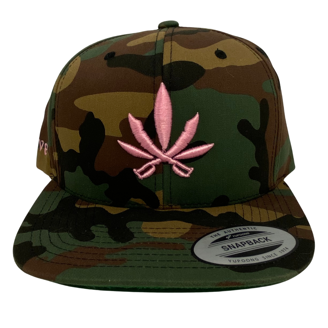 Make a statement without saying a word. The CannaCove Snapback Camo CannaCove Hat blends rugged outdoor vibes with bold streetwear flair, creating a one-of-a-kind piece that turns heads and sparks conversation. Featuring an exclusive design with a vibrant pink cannabis leaf made from crossed switchblade knives, this hat pushes boundaries while staying rooted in authenticity.